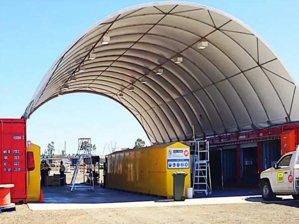 Construction of a Container Shelter is remarkably easy for Port Shipping Containers. Depending on the size of the shelter, shipping containers are placed parallel to each other on either side of the space that needs to be sheltered. The domed shelter component is then mounted on top of the parallel shipping containers to create a high-domed cover over the space in between. A secure and sturdy, yet completely portable shelter is now in place. End walls are also available if a completely enclosed shelter is required and both permanent and portable shipping container shelters are available.